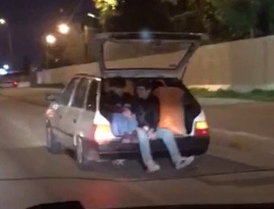 Adana’da seyir halindeki bir otomobilin bagajında yolculuk eden 2 kişi görenleri şaşkına çevirdi.