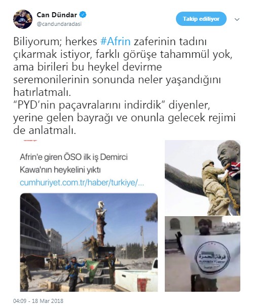 Can Dündar twitter hesabından yaptığı paylaşımda, 'Biliyorum; herkes Afrin zaferinin tadını çıkarmak istiyor, farklı görüşe tahammül yok ama birileri bu heykel devirme seremonilerinin sonunda neler yaşandığını hatırlatmalı. “PYD'nin paçavralarını indirdik” diyenler, yerine gelen bayrağı ve onunla gelecek rejimi de anlatmalı' ifadelerini kullandı.