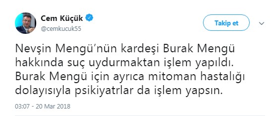 Gazeteci - Yazar Cem Küçük de twitter hesabından, 'Nevşin Mengü'nün kardeşi Burak Mengü hakkında suç uydurmaktan işlem yapıldı. Burak Mengü için ayrıca mitoman hastalığı dolayısıyla psikiyatrlar da işlem yapsın' yorumunu yaptı.