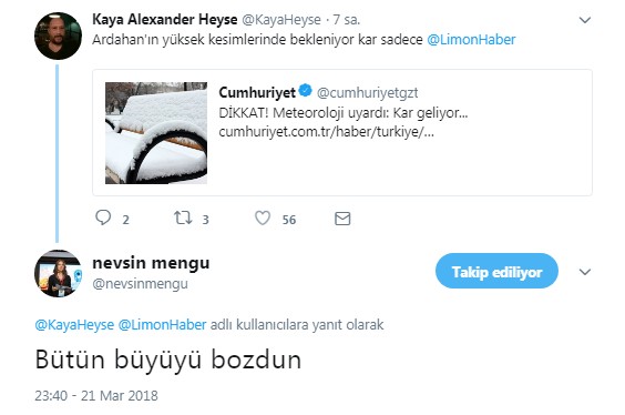 Nevşin Mengü, Twitter'da bir arkadaşının 'Ardahan'ın yüksek kesimlerinde bekleniyor kar sadece' paylaşımına 'Bütün büyüyü bozdun' yorumunu yaptı.
