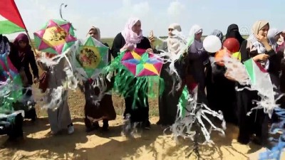 Gazze'nin doğu sınırında düzenlenen etkinliğe katılan aktivistlerin bazıları uçurtmalarını Filistin haritası şeklinde yaparken, bazıları ise Filistin bayrakları taşıdı.