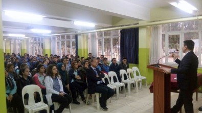 konferans salonunda YKS Yükseköğretim Kurumları Sınavı (YKS) öncesi bölüm ve alan tercihi yapacak olan öğrencilerle bir araya gelen