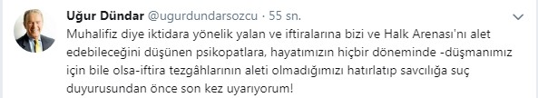 İftira ve yalanla kurulan tezgaha alet olmayacağını yazan Dündar 'Muhalifiz diye iktidara yönelik yalan ve iftiralarına bizi ve Halk Arenası'nı alet edebileceğini düşünen psikopatlara, hayatımızın hiçbir döneminde -düşmanımız için bile olsa-iftira tezgâhlarının aleti olmadığımızı hatırlatıp savcılığa suç duyurusundan önce son kez uyarıyorum!' tweeitini attı.