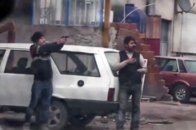 Tutuklanan İ.A. ve E.Ö.’nün İzmir’in Buca ilçesindeki boş bir arazide tabancayla atış talimi yaparken çekilmiş görüntüleri de ortaya çıktı. Görüntülerde, eski model bir otomobilin yanında duran iki zanlı, sırayla hedefe tabancayla ateş ediyor. İ.A. ve E.Ö. hem diz çökerek hem de ayakta nişan alıp silahı ateşliyor.