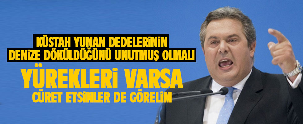 Yunanistan Savunma Bakanı Panos Kammenos, Türkiye hakkında tahrik edici açıklamalarına bir yenisini ekledi. "Eğer yürekleri yetiyorsa kara, hava ve denizdeki Yunan hakimiyetini 1 cm dahi olsa sorgulamaya cüret etsinler" dedi