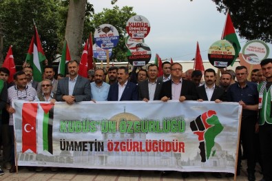 Yapılan basın açıklamasında ‘Katil İsrail, işbirlikçi ABD’, ‘Bağımsız Kudüs, bağımsız Filistin’ ve ‘Kur’an-a uzanan eller kırılsın’ sloganları atıldı.