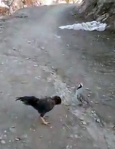 Dışarı çıktığında horoza kafa tutan keklik kavgadan galip geldi. Kekliğin ısrarla saldırdığı horoz bir süre dayandıktan sonra kaçarak olay yerinden uzaklaştı.