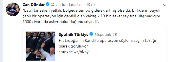 Dündar, kişişel hesabından Kandil harekatıyla ilgili '“Batılı bir askeri yetkili, bölgede tempo giderek artmış olsa da, birliklerin büyük çaplı bir operasyon için gerekli olan yaklaşık 10 bin asker sayısına ulaşmadığını, 1000 civarında asker bulunduğunu söyledi”.' paylaşımında bulundu.