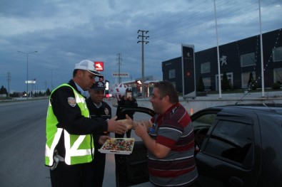Çorum’da polis ekipleri, Ramazan Bayramı’nın ilk saatlerinde durdurdukları sürücülerin bayramını kutlayarak şeker ikram etti.
