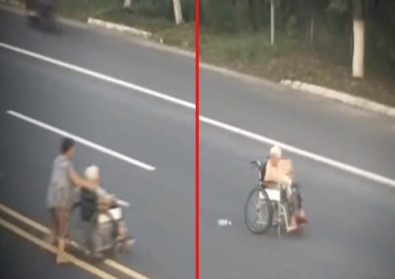 Çin’de kaydedilen görüntülerde, bir kadının tekerlekli sandalyedeki yaşlı kadını yoldan karşıya geçirdiği görülüyor. Bu sırada süratli seyreden bir araç, yardımsever yayaya çarpıyor. Talihsiz kadın çarpmanın etkisiyle havadan defalarca takla attıktan sonra yere çakılıyor. Tekerlekli sandalyedeki yaşlı kadınsa kazayı yara almadan atlatırken o anlar güvenlik kamerasınca böyle kaydediliyor.