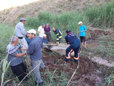 Kuluncak ilçesine bağlı Sincanlı Boğazı mevkiinde Ali Şekerci’ye ait iki inek çamura saplandı. Uzun süre hayvanlarını kurtaramayan Şekerci, itfaiye ekiplerini aradı. Bölgeye gelen