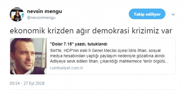 İlhan'ın tutuklanmasını hazmedemeyen Mengü, Twitter hesabından yaptığı paylaşımda, 'Ekonomik krizden ağır demokrasi krizimiz var' ifadesini kullandı.