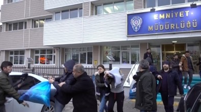 Gözaltına alınan biri kadın 4 şahısın emniyetteki işlemlerin ardından cezaevine götürülmek üzere araca bindirilirken tutuklu şahıs E.E., görüntü almaya çalışan İHA muhabirinin kamerasına tekme atarak hakaret içerikli sözler sarf etti.