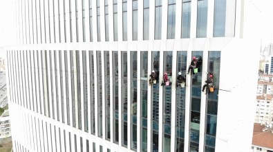Öte yandan işçilerin zorlu çalışması havadan görüntülendi. Görüntülerde temizlik işçilerin bellerine bağlı iplerle film sahnesini andıran şekilde temizlik yapıyorlar. 130 metreden aşağı sarkan işçiler vatandaşların korkulu bakışları arasında temizlik yapıyor.