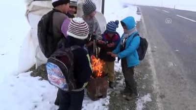 İl merkezine bağlı Mercimekkale köyü yakınlarında ikamet eden ve taşımalı eğitimle il merkezine giden çocuklarının Varto-Muş kara yolunda okul servisi beklerken soğuktan etkilenmemesi için yol kenarında kulübe yapan Engin, ateş de yakıyor.