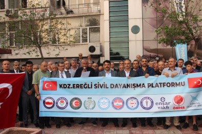 Kdz. Ereğli ilçesinde Memur Sen başta olmak üzere Kızılay, Ensar Vakfı, Önder, Eğitim Bir Sen, Hak-İş, İHH, Bem Bir Sen, Diyanet Sen, Enerji Bir Sen, TEKDER, MÜSİAD, Sağlık Sen ve TÜRGEV üyeleri Türkiye’nin güney sınırında PKK/PYD/YPG’ye yönelik olarak yürüttüğü Barış Pınarı Harekatı’na destek vermek için bir araya geldi. AK Parti Kdz. Ereğli İlçe Başkanı Fatih Çakır ve parti yöneticilerinin katıldığı toplantıda STK’lar adına basın açıklamasını Memur Sen Kdz. Ereğli Temsilcisi Ziya Babal yaptı. Türkiye’nin güney sınırında bir terör devleti kurmasına asla izin vermeyeceğini dile getiren Babal, "Millet olarak bir kez daha tarihi günlere şahitlik ederken ülke olarak da bir kez daha istiklal ve istikbal mücadelesi veriyoruz. Komşumuz Suriye’de yıllardır devam eden dost ve iç savaş ortamı beraberinde kan ve gözyaşı getirmiş, bu kan ve gözyaşı sonucunda da yüz binlerce masum insan ölmüş, milyonlarcası da ülkesini terk etmek zorunda kalmıştır. Türkiye ise ülkesini terk etmek zorunda kalan milyonlarca Suriyeli mazluma kapılarına açarak tüm dünyaya insanlık dersi vermiştir." dedi.