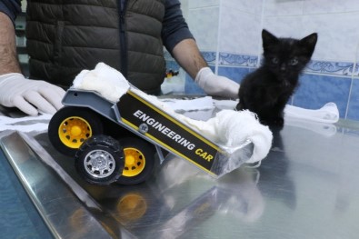 Edirne’de, üniversite öğrencileri tarafından bulunan ve arka ayakları felçli olan yavru kediye, Sokak Hayvanları Barınağı ekiplerince, oyuncak arabadan yürüteç yapıldı.