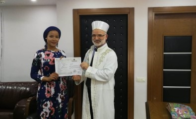 Merasim sonrasında İlçe Müftüsü Dr. Erenay, Neyla Nadide’ye ihtida belgesini takdim etti.