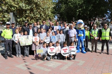 Kaymakam Ürkmezer ve diğer protokol üyeleri, yayalara ve sürücülere broşür dağıttı.