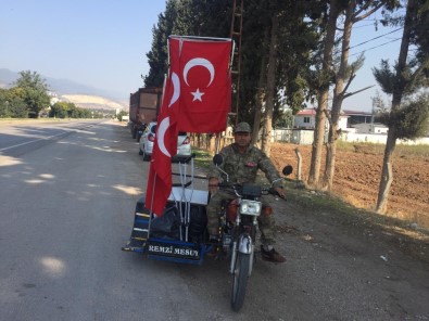 Kayışkanat, asker selamı vererek Türk bayrakları ile donattığı engelli motosikleti ile Şanlıurfa’ya doğru hareket etti.