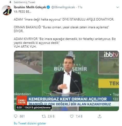 Gökçek tweetinde şu ifadelere yer verdi: Ya pes be... Adam, 'İmara değil halka açıyoruz' diye İstanbullu afişle donatıyor. Orman Bakanlığı, 'Burası orman, yasal olarak zaten imara açılamaz' diyor. Adam kıvırıyor. 'Biz imara açacağız demedik, bir felsefeyi anlatıyoruz. Biz yaptık demedik ki açıyoruz dedik.' yuh artık yuh.