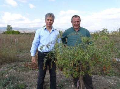 Kütahya’nın Hisarcık ilçesinde kiraladıkları 10 dönüm araziye şifalı Goji Berry meyvesi diken İsmail Yaldız ve Süleyman Taşdemir bazı fidanların ilk yıl meyve vermesinden memnun olduklarını ifade ettiler.