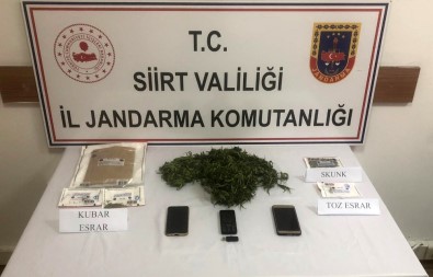 Siirt il merkezinde bulunan evlerinde ve bahçelerinde müşterek olarak icra edilen operasyon sonucu 3 şüpheli ile birlikte, 100 gram esrar maddesi, 10 gram skunk isimli