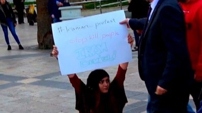 Ardından eylemciler arasında olan genç 1 kız üzerinde İngilizce ‘İran’da protesto eden insanları öldürmeyin’ yazılı bir döviz açtı. Daha sonra eylemcilerin pankart açmaya çalıştığını da gören polis ekipleri olaya müdahale etti.