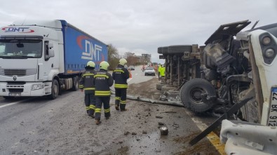 Kontrolden çıkan kamyon, demir bariyerlere çarptıktan sonra devrildi. Hafif yaralanan kamyon sürücüsü Demirelli, sağlık ekiplerince Trakya Üniversitesi Tıp Fakültesi Hastanesine kaldırıldı.
