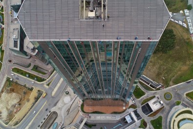 Endüstriyel dağcıların 284 metre yükseklikteki gökdelen mesaisi nefes kesti. Gökdelenlerin tepesinden komando gibi teçhizatla donanıp iple sarkarak inen işçiler dış cephe temizliğini yaparken havadan görüntülendi.
