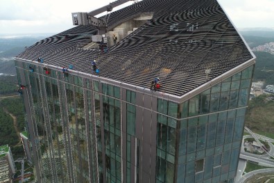 Endüstriyel dağcıların 284 metre yükseklikteki gökdelen mesaisi nefes kesti. Gökdelenlerin tepesinden komando gibi teçhizatla donanıp iple sarkarak inen işçiler dış cephe temizliğini yaparken havadan görüntülendi.