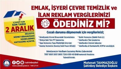 Şahinbey Belediyesi vatandaşların hiçbir sorun yaşamadan vergi borçlarını ödeyebilmeleri için Şahinbey Belediyesi hizmet binalarındaki vezneler 30 Kasım Cumartesi ve 01 Aralık Pazar gününde hizmet verecek.