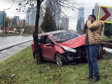 TEM Otoyolu Levent bağlantı yolunda yağış nedeniyle kayganlaşan yolda sürücüsünün direksiyon hakimiyetini kaybettiği otomobil kayarak refüje çıktı. Metrelerce sürüklenen araç bariyerler ile ağaç arasında sıkışırken, genç sürücü kazayı yara almadan atlattı.