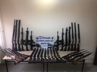 bonzai maddesi, 4 adet captagon hap, 2.92 gram jameika maddesi, 6 adet ruhsatsız tabanca, çok sayıda tabanca parçaları, 31 adet tüfek, 1 adet çalıntı