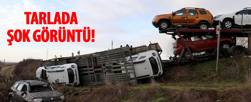 Edirne'de sıfır kilometre cipleri taşıyan TIR tarlaya devrildi
