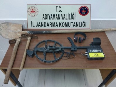 kaçak kazı yapan 2 şahsı gözaltına aldı. Jandarma ekipleri 1 kazma, 1 kürek, 1 keser ve 1 adet dedektör ele geçirdi. Malzemelere