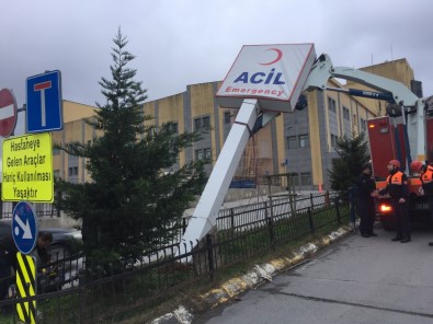 Şiddetli rüzgar Arnavutköy Devlet Hastanesi önünde bulunan “Acil” tabelasını da devirdi. Hastane personeli devrilen tabelanın vatandaşların üzerine düşmemesi için önlem aldı. İtfaiye ekipleri tabelayı sökerek kazaya sebebiyet vermesini engelledi.