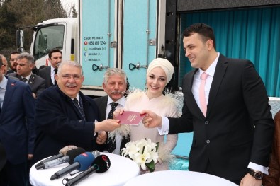 Atatürk Parkı Nikah Sarayı’nda gerçekleşen etkinlikte, Belediye Başkanı Hanefi Mahçiçek çiftlerin nikahlarını kıyarak hediyelerini verdi.