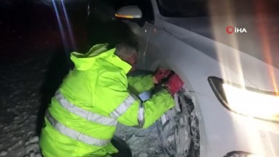 Zincir ve kar lastiği bulunmayan araçların kar ve tipiye hazırlıksız yakalandığı 1825 rakımlı Alacabel mevkiinde karayolları ekipleri yolda kalan araçları iş makineleri yardımıyla kurtarırken, ilerleyemeyen araçların sahipleri de zincir takarak yollarına devam etmeye çalıştı.