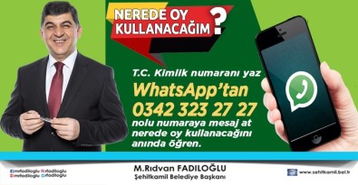 Amaçlarının hayatı kolaylaştıran inovatif uygulamaları kullanarak vatandaşın yapacağı işlemleri pratik bir biçimde gerçekleştirmesine olanak sunmak olduğunu vurgulayan Şehitkamil Belediye Başkanı Rıdvan Fadıloğlu, “Vatandaşlarımızın iradesini sandığa yansıtmak adına çok önemli bir çalışma gerçekleştirdik. Halkımızı, oyunu nerede, hangi sandıkta ve hangi sırada kullanacağıyla bilgi sahibi yaptığımız bir sistem geliştirdik. Çağ teknoloji çağı. Bizim de teknolojinin tüm imkanlarından en iyi şekilde yararlanmamız gerekir. İşte bu düşünceyle mobil cihazlarda bulunan WhatsApp üzerinden yapılacak basit bir işlem ile vatandaşımızın oy kullanmaya giderken işini kolaylaştırdık. Bu sistemden yararlanmak isteyen vatandaşlarımızın öncelikle Şehitkamil Belediyesine ait 0342 323 27 27 irtibat numarasını telefonlarına kaydetmeleri gerekiyor. Daha sonra vatandaşlarımızın telefonlarına kaydettikleri 0342 323 27 27 irtibat numarasına WhatsApp uygulaması üzerinden TC kimlik numaralarını yazıp yollamaları yeterli olacaktır. Bu işlemi gerçekleştiren vatandaşlarımızın cep telefonlarına anında oyunu hangi mahalle, hangi okul, hangi sandık, hangi sırada kullanacağı bilgisi yollanıyor. Ayrıca gelen mesajda oy kullanılacak yerin koordinat bilgisini veren bir link de yollanıyor. Vatandaşlarımız, mesajdaki linki tıklayarak Goggle Maps uygulaması üzerinden isterse yaya olarak isterse de araçla kolaylıkla oy kullanacağı adrese gidebilecek” diye konuştu.