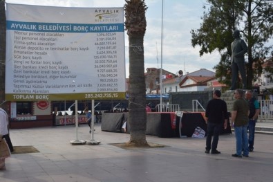 Balıkesir’in Ayvalık ilçesinde; 31 Mart yerel seçimlerini kazanarak, CHP’den belediyeyi devralan Belediye Başkanı Mesut Ergin, Ayvalık Belediyesi’nin içinde bulunduğu yaklaşık 300 milyon liralık borç tablosunu ilçe merkezine astığı dev pankartla halkın bilgisine sundu.