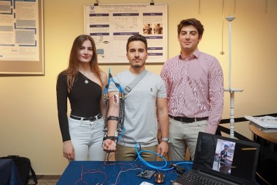 “Günümüzde pek çok insan, geçirdikleri kaza sonrasında ya da iş sırasında uzun süre ağır nesneler taşımak zorunda kaldığı için sinir ve kas sağlığı sorunları yaşıyor. Oluşan bu problemler insanların yaşamını büyük ölçüde olumsuz etkiliyor. Bu nedenle hem Bilgisayar Mühendisliği Bölümü hem de Elektrik Elektronik Mühendisliği Bölümü öğrencileri olarak ortak bir proje tasarlamak istedik. Böylece üst uzuvlara yönelik hareket destekçi ve rehabilitasyon amaçlı kullanılabilecek bir dış iskelet robot tasarladık. İnsan-robot etkileşimini sağlayan bir sensöre sahip olan robotumuz her iki kolo da takılıp kullanılabiliyor. Tüm statik-dinamik testleri başarıyla geçen dış iskelet robotumuz tek başına 20 kilogram yük taşıma kapasiteli olup, biseps kası ve dirsek eklemlerini destekliyor. Yani kas üzerindeki zorlanma, robot tarafından belirlenen sınırlarda minimalize ediliyor”