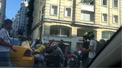 Taksim İstiklal Caddesi üzerinde yürüme engelli vatandaş, bulunduğu taksinin durduğunu düşünerek inmeye çalıştığı esnada taksicinin gaza basması sonucu yere düştü. Çevredeki vatandaşlarca yerden kaldırılan adam tekerlekli sandalyeye konuldu.