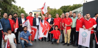 İTO Meclis Başkanı Öztürk Oran ve Yönetim Kurulu Başkanı Şekib Avdagiç başkanlığındaki heyet, kahraman şehitlerimiz ve gazilerimiz anısına Türk bayraklarıyla Atatürk Havalimanı’ndaki resmi tören alanına yürüyüş gerçekleştirdi.