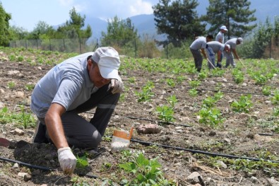 Konyaaltı Belediyes’nin, Çandır fasulyesinin yeniden hayat bulması için Yarbaşçandır Mahallesi’nde 5 bin metrekare alanda ekimini yaptığı fasulyenin çapalama işlemi yapılıyor.