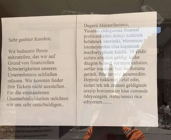 THY'nin yanı sıra, Sun Express'ten bilet alanlar da mağdur olurken, kayıplara karışan Mehmet Y. bürosunun camına Türkçe ve Almanca olarak; mali zorluk içinde olduğunu, büroyu kapattığını ve herkesin hakkını helal etmesini istediğini belirten yazı astı.
