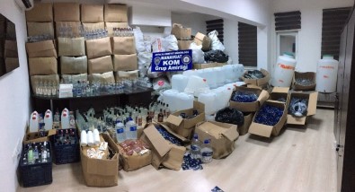 içki şişesi, 3 bin 956 adet bilyeli alkol şişe kapağı, 99 adet kapaksız boş alkol şişesi, 56 adet TAPDK bandrolü bulunmayan