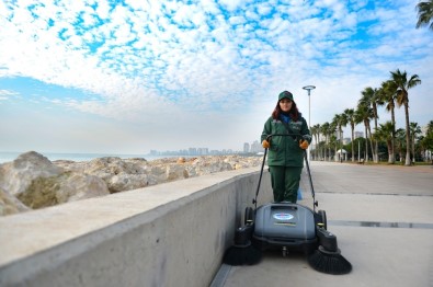 Sahil bandı ve kaldırımlar artık süpürge makinesiyle temizleniyor