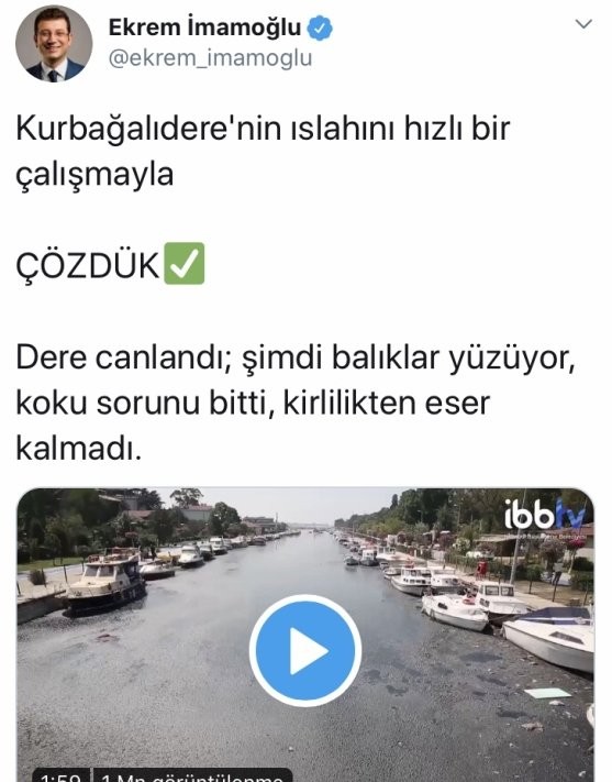 İstanbul Büyükşehir Belediyesi Başkanı Ekrem İmamoğlu; 'Kurbağalıdere'nin ıslahını hızlı bir çalışmayla çözdük. Dere canlandı. Şimdi balıklar yüzüyor, koku sorunu bitti, kirlilikten eser kalmadı' açıklamasında bulunmuş ve derenin kendi yönetimleri tarafından temizlendiğini öne sürmüştü.