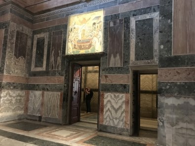 Namaz kılınacak bölümdeki mozaiklerin üzerine açılır kapanır perde sistemi kuruldu. Mozaikler, namaz sırasında kapatılacak.
